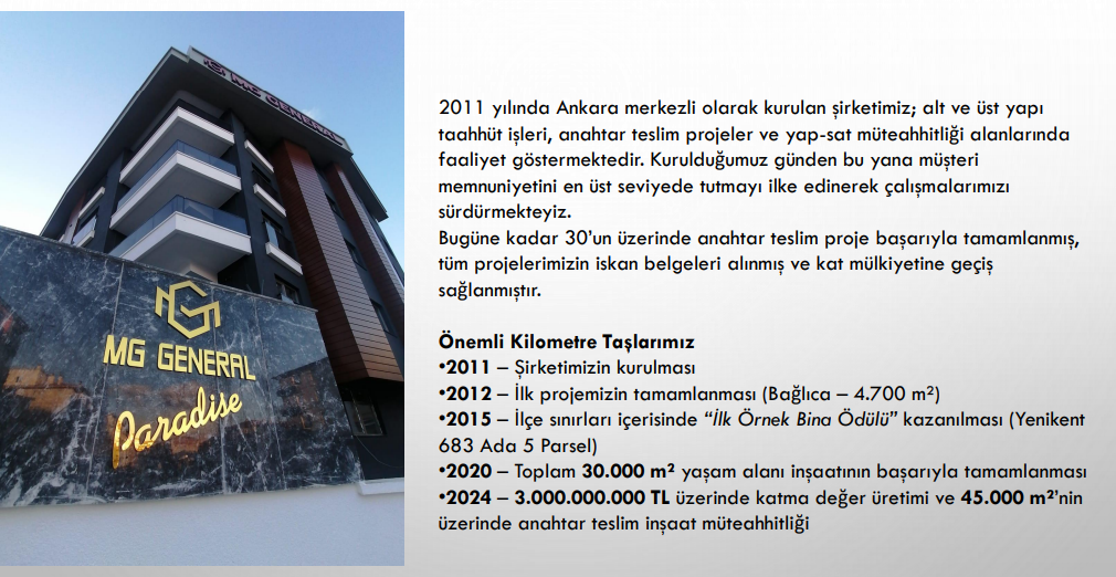 2011 yılında Ankara merkezli olarak kurulan şirketimiz, alt ve üst yapı taahhüt işleri, anahtar teslim projeler ve yap-sat müteahhitliği alanlarında yüksek standartlı ve güven odaklı projeler üretmektedir. Kuruluşumuzdan bu yana hedefimiz; yalnızca yapı inşa etmek değil, kalıcı değerler ve güçlü yaşam alanları oluşturmaktır.